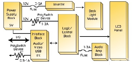 圖3顯示了在LCD電視監(jiān)測器中PolySwitch元件可以安放的位置,以幫助提供過電流保護。為了充分發(fā)揮PolySwitch元件的影響,可以將其和金屬芯電路板或者LCD散熱片熱結合在一起。如果LCD沒有內置的ESD保護,可以向ESD并聯一個PESD保護元件,以幫助避免由ESD電壓浪涌造成的破壞。