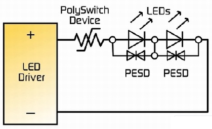 電源線耦合電壓瞬變和浪涌也可以降低LED的預期使用壽命,許多的LED驅動器容易受到不合適的DC電壓水平和極性的破壞。LED驅動器的輸出也可能被短路破壞或者摧毀。大多數LCD電視應用的LED驅動器包括內置安全裝置,包括熱關閉以及開路、短路LCD檢測。然而,可能還需要另外的過流保護元件以幫助保護集成電路(IC)以及其它敏感的電子元件。PolySwitch元件也可以被用來幫助防止當監(jiān)測器的冷卻口被堵塞時可能發(fā)生的熱失控情況。由于其具有對溫度過高的情況有檢測和反應的能力,一個安裝合適的PolySwitch元件可以在LCD沒有足夠電壓運行的情況下中斷電流。