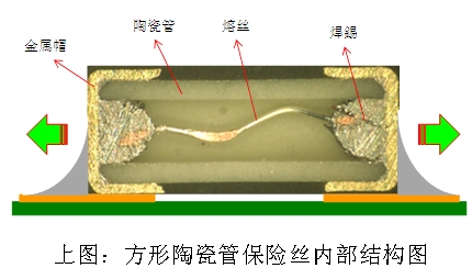 在市場(chǎng)上常見(jiàn)的2410尺寸125Vac或250Vac額定電壓貼片保險(xiǎn)絲, 多是應(yīng)用傳統(tǒng)方形陶瓷管技術(shù)。這一類型貼片保險(xiǎn)絲的兩端是采用金屬帽直接套在方型陶瓷管上, 再以焊錫將金屬帽與內(nèi)部熔絲焊接在一起。一旦產(chǎn)品在高溫的SMT產(chǎn)線上作業(yè),連結(jié)兩端金屬帽與內(nèi)部熔絲的焊錫極有可能會(huì)因高溫而再次發(fā)生熔融情形, 進(jìn)而導(dǎo)致金屬帽脫落的風(fēng)險(xiǎn)。