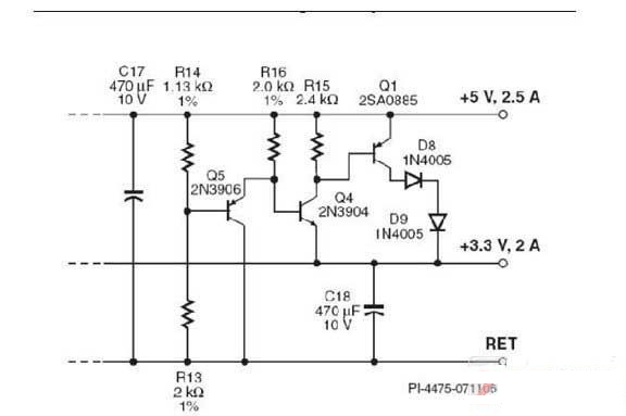 Q1中的電流量由兩個輸出端的電壓差異決定。因此,該電路可以使兩個輸出端均保持穩(wěn)壓,而不受其負載的影響,即使在3.3V輸出端滿載而5V輸出端無負載這樣最差的情況下,仍能保持穩(wěn)壓。設計中的Q5和Q4可以提供溫度補償,這是由于每個三極管中的VBE溫度變化都可以彼此抵消。二極管D8和D9不是必需的器件,但可用于降低Q1中的功率耗散,從而無需在設計添加散熱片。
