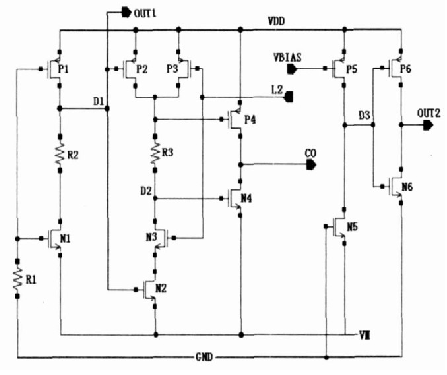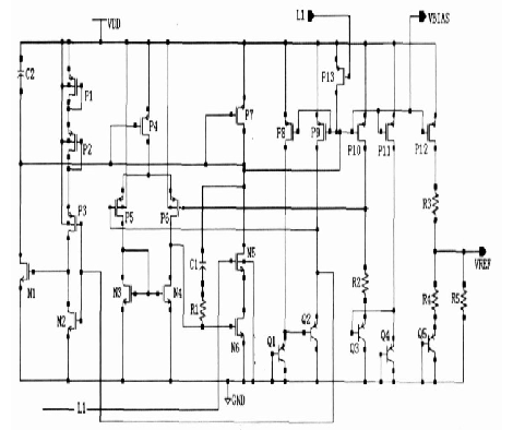 圖1中N1,N2, P1, P2, P3, C1作為啟動電路,有源電阻P1, P2 起限流作用。N5, P13 為開關(guān)管,當(dāng)保護(hù)電路處于休眠狀態(tài)時,電路必須停止工作,使功耗降為最低,此時通過內(nèi)部控制電路使L1 為低電位, P13 管打開,使偏置點VB IAS上升為高電位,P4, P7, P8, P9 , P10, P11, P12管截止,N5管關(guān)閉,切斷由P13,N6形成的支路,該電路停止工作,電流幾乎為零。經(jīng)仿真,該基準(zhǔn)電路在2. 2V電壓下可正常工作。