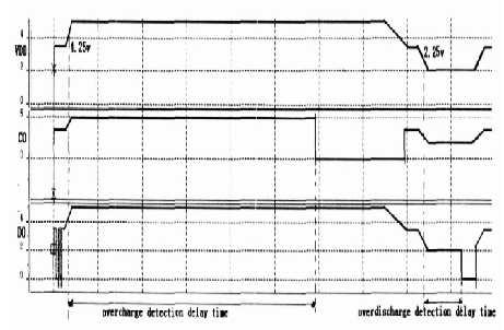 圖5為過充與過放電檢測的HSPICE仿真時序圖,從中可以看出,當(dāng)比較器檢測到電池過充,在這里過充檢測點為4. 25V,且該狀態(tài)保持時間達(dá)到過充電檢測延遲時間,在這里約為1. 2秒, CO輸出低電平,關(guān)斷充電用FET2,停止充電。當(dāng)檢測到電池過放電,這里過放電檢測點為2. 25V,且該狀態(tài)保持時間達(dá)到過放電檢測延遲時間約150毫秒,DO輸出低電平,關(guān)斷放電用FET1,停止放電。其它如放電過流檢測等功能經(jīng)HSP ICE仿真完全符合要求,在這里不一一列出。