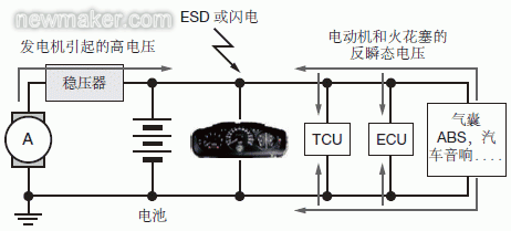 電子控制單元、傳感器和信息娛樂系統(tǒng)等汽車電子設(shè)備連接在一根電源線上(圖4)。這些電子產(chǎn)品的電源是電 池和交流發(fā)電機,這兩種電源的輸出電壓都不穩(wěn)定,容易受溫度、工作狀態(tài)和其他條件影響。此外,使用燃油噴射系統(tǒng)、閥、電機、電氣和水解控制器等電磁線圈負 載的汽車系統(tǒng),會把ESD、尖峰噪聲和其他類型的瞬態(tài)和浪涌電壓引入到電源和信號線上。