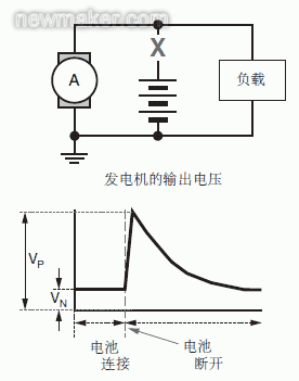 最糟糕的浪涌電壓發(fā)生在引擎運轉(zhuǎn)時電池斷開,交流發(fā)電機為汽車電源線提供電流時,這種情況就是所說的“甩負荷”。大多數(shù)汽車制造商和工業(yè)協(xié)會都會為這種甩負荷狀態(tài)制定最高電壓、線路阻抗和這種甩負荷狀態(tài)的持續(xù)時間,如圖5所示。甩負荷的電源阻抗會高于正常瞬態(tài)測試時的電源阻抗,因為電池斷開而只有發(fā)電機在向外輸出電能,這時交流發(fā)電機的內(nèi)部線圈相當于一個限流電阻。