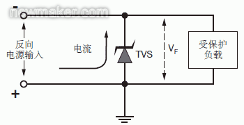 MOSFET的柵極在-1V或更低的反向電壓下也很脆弱。在反向電源輸入模式中,電源線電壓與TVS VF的電壓相同。這種反偏模式會引起電子線路故障。外延型TVS的低正向壓降能夠很好地解決這個問題。保護電路免受反向電源輸入損害的另一種方法是在電源線上使用一個極性保護整流器,如圖8所示。極性保護整流器應(yīng)該有足夠的正向額定電流及正向浪涌和反向電壓性能。