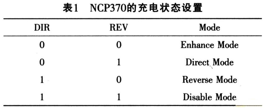 將NCP370的DIR端強(qiáng)制拉低,并將DEV端拉高,NCP370即可進(jìn)入正向充電狀態(tài)。而將DIR端置高時(shí),OUT端會(huì)與IN端斷開,具體的充電狀態(tài)設(shè)置如表1所列。另外,DIR也會(huì)受到OVLO或U-VLO故障的影響(FLAG有效)。