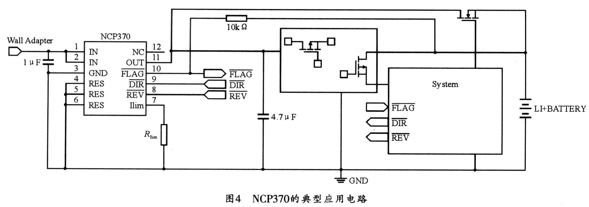 DIR:正向模式輸入端,需與REV結(jié)合起來使用。當(dāng)墻上適配器AC-DC連接到IN端時(shí),NCP370內(nèi)部的N溝道MOS管開啟,電路進(jìn)入正向模式。而當(dāng)該端和REV均為高時(shí),NCP370進(jìn)入關(guān)斷模式,此時(shí),輸出將與輸入斷開。但DIR端的狀態(tài)不會(huì)影響到FLAG的故障檢測(cè)。