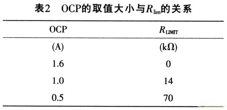 當(dāng)外設(shè)電阻Rlim上的電流(Ilim)高于Iocp時(shí),流過其內(nèi)部N溝道MOS管的電流就會(huì)受到限制,這樣,NCP370就能提供從電池到外設(shè)的反向過流保護(hù)功能。由于NCP370的內(nèi)部電阻與Ilim是串聯(lián)關(guān)系,因此,當(dāng)Ilim引腳直接與GND相連時(shí),其OCP最大,而在它們之間接入Rlim時(shí),其OCP會(huì)減小,OCP的取值大小如表2所列。當(dāng)電流高于OCP時(shí),其內(nèi)部的NMOS會(huì)關(guān)斷,且/FIAG會(huì)置低,同時(shí)NCP370會(huì)通知微控制器來對(duì)故障進(jìn)行處理,并禁止反向充電模式。