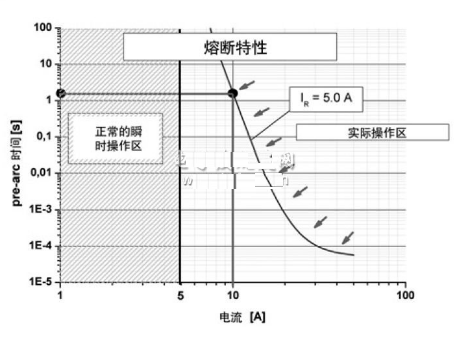 熔斷特性(見圖1)是貼片式保險絲最重要的特性,該特性定義了在一定過流等級下的熔融時間。如果電流達(dá)到預(yù)設(shè)等級,在被稱為pre-arc時間的周期內(nèi),熔體里散發(fā)的電功率足以將熔體熔融和蒸發(fā)掉。