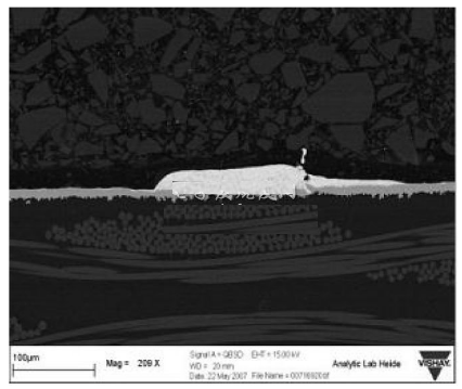 厚膜電阻的使用經(jīng)驗表明,短時過載、焊接熱等熱應(yīng)力和脈沖應(yīng)力會使阻值發(fā)生漂移。這些在貼片式保險絲里發(fā)生的現(xiàn)象將會改變保險絲的特性,進而縮短熔斷時間。雖然熔體使用了幾種不同的材料,例如銅錫合金,可以達(dá)到高水平的I2T,但在持續(xù)的熱應(yīng)力之后,熔體對斷開時間的縮短是非常敏感的。這是由于應(yīng)力會導(dǎo)致熔體組成材料的遷移,如圖2所示,該圖顯示了在施加脈沖負(fù)載應(yīng)力之后,銅錫合金正在發(fā)生遷移的情況。
