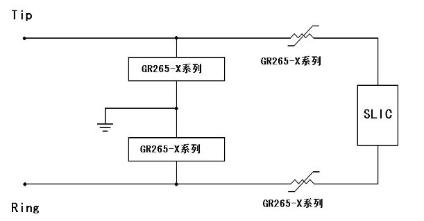 目前本公生產(chǎn)的GR265-X和GR600-X 等系列高分子PTC 熱敏電阻和半導(dǎo)體固體放電管一起用于總配線架的保安單元中,可以滿足過(guò)流和過(guò)壓保護(hù)的要求,同時(shí)幫助保安單元滿足中國(guó)通信行業(yè)標(biāo)準(zhǔn) YD/T 694-1999-2002、北美 TelcordiaGR-974 及 ITU-T K.20 等標(biāo)準(zhǔn),典型的使用電路如上圖所示。