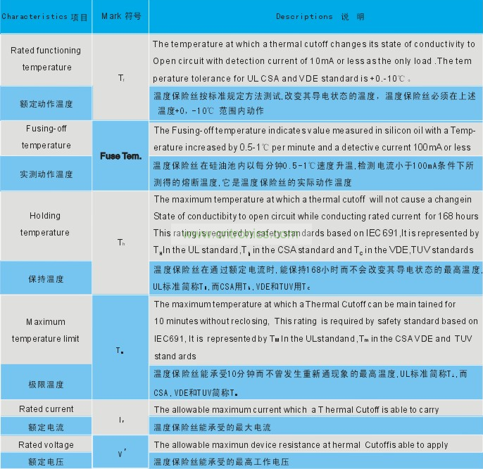 當(dāng)溫度保險(xiǎn)絲周圍溫度上升到它的動作溫度時(shí),其易熔合金熔化并在表面張力作用下及特殊樹脂幫助作用下,收縮成球狀附兩引腳未端或保險(xiǎn)絲內(nèi)彈簧的彈力推走電極作用,這樣電路被切斷