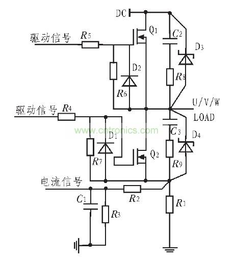 當(dāng)電流過大或者發(fā)生短路時(shí),功率MOSFET漏極與源極之間的電流會迅速增加并超過額定值,必須在過流極限值所規(guī)定的時(shí)間內(nèi)關(guān)斷功率MOSFET,否則器件將被燒壞,因此在主回路增加電流采樣保護(hù)電路,當(dāng)電流到達(dá)一定值,通過保護(hù)電路關(guān)閉驅(qū)動電路來保護(hù)MOSFET管。圖1是MOSFET管的保護(hù)電路,由此可以清楚的看出保護(hù)電路的功能。