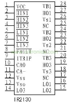 根據(jù)柵極電壓與柵極電容的乘積為柵極電荷Q則上式可轉(zhuǎn)化為T=Q/I.本設(shè)計(jì)中功率MOSFET采用IR公司的IRF3710S功率MOSFET芯片,從其datasheet可以得到MOSFET的柵極電荷為26 nC,導(dǎo)通/截止時(shí)間為106 ns,可以得到峰值驅(qū)動電流為,驅(qū)動電壓為12 V,本設(shè)計(jì)驅(qū)動芯片采用IR公司的IR2130驅(qū)動模塊,該芯片可用來驅(qū)動工作在母電壓不高于600 V的電路中的功率MOS門器件,其可輸出的最大正向峰值驅(qū)動電流為250mA,輸出驅(qū)動電壓為10~20V而反向峰值驅(qū)動電流為500 mA.它內(nèi)部設(shè)計(jì)有過流、過壓及欠壓保護(hù)、封鎖和指示網(wǎng)絡(luò),使用戶可方便的用來保護(hù)被驅(qū)動的MOS門功率管,加之內(nèi)部自舉技術(shù)的巧妙運(yùn)用使其可用于高壓系統(tǒng),它還可對同一橋臂上下2個功率器件的門極驅(qū)動信號產(chǎn)生2μs互鎖延時(shí)時(shí)間。它自身工作和電源電壓的范圍較寬(3~20 V),在它的內(nèi)部還設(shè)計(jì)有與被驅(qū)動的功率器件所通過的電流成線性關(guān)系的電流放大器,電路設(shè)計(jì)還保證了內(nèi)部的3個通道的高壓側(cè)驅(qū)動器和低壓側(cè)驅(qū)動器可單獨(dú)使用,亦可只用其內(nèi)部的3個低壓側(cè)驅(qū)動器,并且輸入信號與TTL及COMS電平兼容。IR2130管腳如圖2所示。