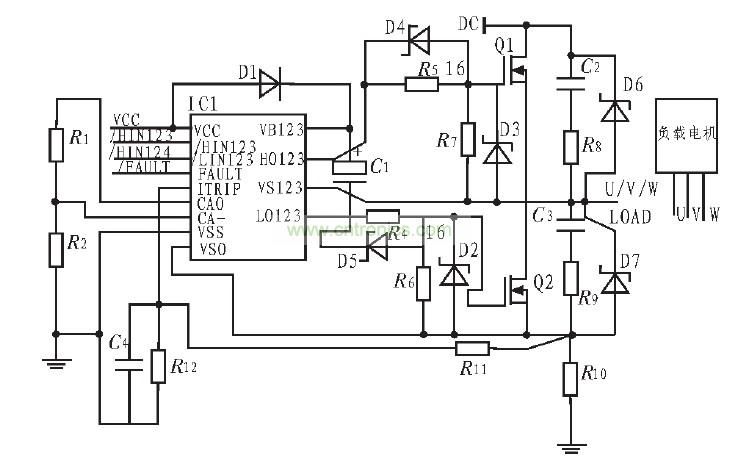 圖3是由IR2130組成的無刷直流電機(jī)驅(qū)動原理圖為便于表示只畫出其中一個橋臂的電路示意圖,通過IR2130輸入信號控制MOSFET的開關(guān),由此驅(qū)動無刷直流動機(jī)。C1是自舉電容,為上橋臂功率管驅(qū)動的懸浮電源存儲能量,D1的作用是防止上橋臂導(dǎo)通時(shí)母線電壓倒流到IR2130的電源上而使器件損壞,因此D1應(yīng)有足夠的反向耐壓,當(dāng)然D1與C1串聯(lián)也是為了滿足主電路功率開關(guān)頻率的要求,D1應(yīng)選快速恢復(fù)二極管。 R1、R2、R10、R11、R12、C4組成過流檢測電路。R5、R6為柵極驅(qū)動電阻,D4、D5為功率管提供了一個低阻抗的放電回路,使功率管能夠快速的泄放電荷。