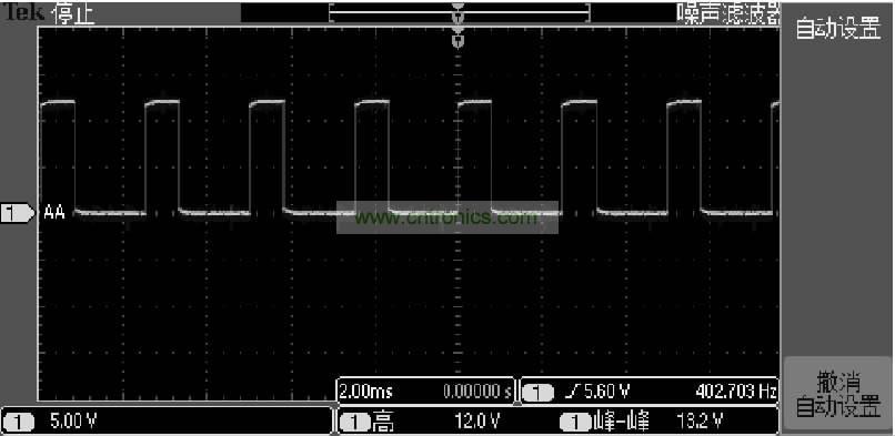 在實(shí)際應(yīng)用中柵極的驅(qū)動波形如圖4所示,此波形是在電機(jī)3000RPM時(shí)的驅(qū)動波形,可以看出此波形完全能夠滿足要求,同時(shí)進(jìn)行了短路、電機(jī)堵轉(zhuǎn)等試驗(yàn),圖3電路也能過很好地保護(hù)功率MOSFET管。