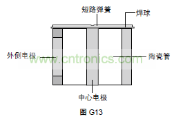 失效保護(hù)機(jī)構(gòu)是焊接在中心電極上帶塑料薄片的短路簧片。在正常的工作條件下,塑料薄片與兩個(gè)外側(cè)電極隔離,如圖G13。當(dāng)長時(shí)間放電使氣體放電管溫度達(dá)到塑料薄片的熔點(diǎn)時(shí),塑料薄片就會(huì)被軟化,促使短路彈片被激活,并與兩個(gè)外側(cè)電極搭接。這個(gè)過程導(dǎo)致三個(gè)電極之間永久短路,建立起一條低阻抗路徑,將故障電流引到地面,而不會(huì)產(chǎn)生顯著的熱量。