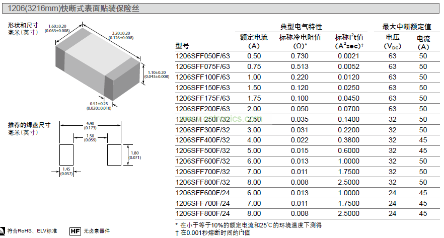 表 FF2 典型的電氣特性、尺寸和推薦焊盤