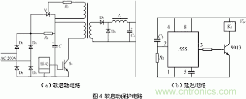 開關(guān)穩(wěn)壓電源的電路比較復(fù)雜,開關(guān)穩(wěn)壓器的輸入端一般接有小電感、大電容的輸入濾波器。在開機瞬間,濾波電容器會流過很大的浪涌電流,這個浪涌電流可以為正常輸入電流的數(shù)倍。這樣大的浪涌電流會使普通電源開關(guān)的觸點或繼電器的觸點熔化,并使輸入保險絲熔斷。另外,浪涌電流也會損害電容器,使之壽命縮短,過早損壞。為此,開機時應(yīng)該接入一個限流電阻,通過這個限流電阻來對電容器充電。為了不使該限流電阻消耗過多的功率,以致影響開關(guān)穩(wěn)壓器的正常工作,而在開機暫態(tài)過程結(jié)束后,用一個繼電器自動短接它,使直流電源直接對開關(guān)穩(wěn)壓器供電,這種電路稱之謂直流開關(guān)電源的 “ 軟啟動 ” 電路。如圖 4 ( a )所示在電源接通瞬間,輸入電壓經(jīng)整流橋( D1 ~ D4 )和限流電阻 R1 對電容器 C 充電,限制浪涌電流。當電容器 C 充電到約 80 %額定電壓時,逆變器正常工作.經(jīng)主變壓器輔助繞組產(chǎn)生晶閘管的觸發(fā)信號,使晶閘管導(dǎo)通并短路限流電阻 R1,開關(guān)電源處于正常運行狀態(tài).為了提高延遲時間的準確性及防止繼電器動作抖動振蕩,延遲電路可采用圖 4 ( b )所示電路替代 RC 延遲電路.。