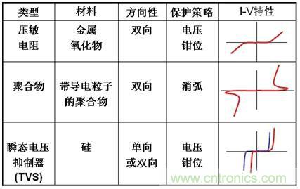 安森美半導(dǎo)體來自美國的ESD保護(hù)專家Robert Ashton博士說,一般而言,ESD保護(hù)元件的分類可以通過其保護(hù)策略與方向性來進(jìn)行,主要包括壓敏電阻、聚合物和瞬態(tài)電壓抑 制器(TVS)等,如表1所示。在這幾種保護(hù)元件中,壓敏電阻在低電壓時(shí),呈現(xiàn)出高電阻,其中的每個(gè)小型二極管兩端的電壓都相當(dāng)?shù)?,同時(shí)電流也相當(dāng)??;而在較高電壓時(shí),其中的獨(dú)立二極管開始導(dǎo)通,同時(shí)壓敏電阻的電阻會(huì)下降。從表1中我們也可以看出壓敏電阻為雙向保護(hù)元件。而對(duì)于帶導(dǎo)電粒子的聚合物而言,在正常電壓下,這些材料擁有相當(dāng)高的電阻,但當(dāng)發(fā)生ESD沖擊時(shí),導(dǎo)電粒子間的小間隙會(huì)成為突波音隙陣列,從而帶來低電阻路徑。