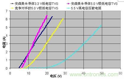 圖5:不同ESD保護(hù)元件的TLP測(cè)試I-V曲線