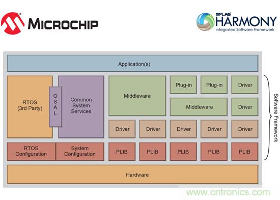 [page]Microchip的全新MPLAB Harmony框架提供了一個將經(jīng)過Microchip測試、調(diào)試和可互操作的代碼集于一體的抽象而靈活的統(tǒng)一代碼源,從而有助于進一步縮短開發(fā)時間并降低成本。此外,Harmony提供了一個模塊化架構(gòu),能夠高效集成多個驅(qū)動程序、中間件和函數(shù)庫,同時提供一個獨立于實時操作系統(tǒng)的環(huán)境。預驗證和集成不僅加快了開發(fā),而且也提高了重復使用率。目前,Harmony框架中包括來自Express Logic、FreeRTOS、InterNiche、WITTENSTEIN High Integrity Systems和wolfSSL等第三方的產(chǎn)品,還有許多正在開發(fā)中。