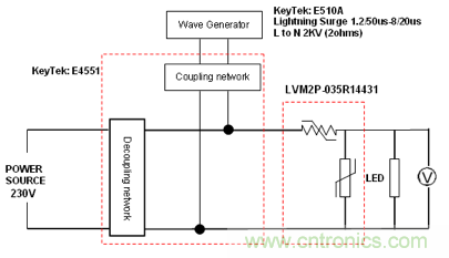 2Pro AC 器件一個常見的應用是 LED 照明,其雷擊的保護要求都小于 2kV surge,2Pro AC 正好可以防護 2kV 的雷擊。下圖是不久前網(wǎng)友調(diào)試的一塊客戶 LED 電路板示意圖,雷擊要求是 2kV,把 2Pro AC 放置于 LED lighting 電路輸入端,再加上雷擊波形發(fā)生器和交流耦合。