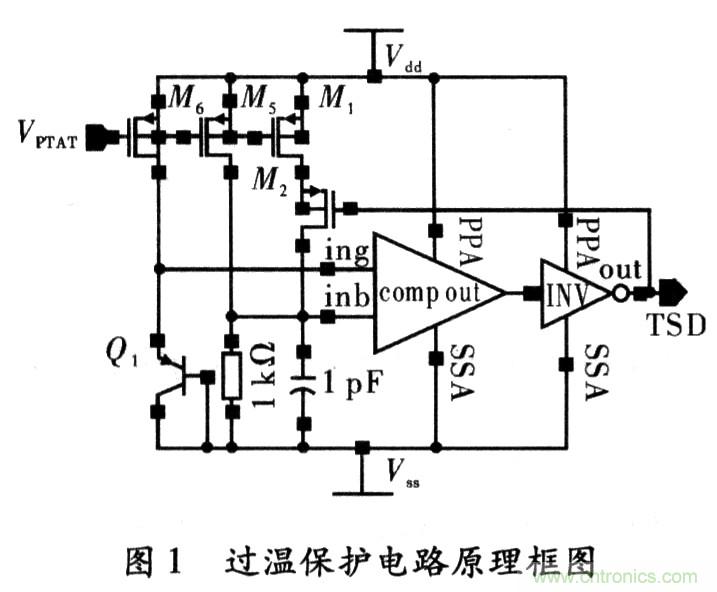 圖1為本設(shè)計的原理架構(gòu),Q1為NWELLCMOS工藝中寄生PNP三極管,其集電極是必須與地點(diǎn)位連接,為了利用寄生PN結(jié)導(dǎo)通正向?qū)妷旱呢?fù)溫度特性,把Q1做二極管連接(基集也接到地),這樣A點(diǎn)和地之間的電壓VA就具有了PN結(jié)正向電壓的與溫度成反比的性質(zhì)。由于基準(zhǔn)電路輸出的偏置電壓加在M0、M1、M5的柵極上,則其所在支路上都會產(chǎn)生PTAT電流(Proportional to Abso-lute Temperature);在提供偏置的同時,也在電阻R0上產(chǎn)生了與溫度成正比的電壓VB即B點(diǎn)電壓隨之增大。當(dāng)達(dá)到某一溫度TH(設(shè)定的關(guān)斷溫度)后,VH≥VA、比較器Comp輸出高電平,經(jīng)過倒相器INV后,輸出TSD為低電平;此信號作用于電路的其它模塊后,使整個芯片停止工作,實現(xiàn)熱保護(hù)功能。同時,TSD信號正反饋?zhàn)饔糜贛2柵上,開啟M2,加大了電阻R0上電流,使VB更高。