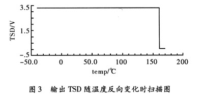 按照以上設(shè)計的電路。用Cadence Specture對其進(jìn)行仿真,器件的模型參數(shù)采用0.35μm CMOS工藝。圖2為過溫保護(hù)電路的輸出控制信號TSD,隨溫度上升和下降的曲線。電源電壓取3.3 V。從仿真結(jié)果可以看出,該電路實現(xiàn)了良好的“溫度遲滯”特性。遲滯功能有效的避免了芯片出現(xiàn)熱振蕩問題。關(guān)斷溫度TH160°和恢復(fù)溫度TL140°。