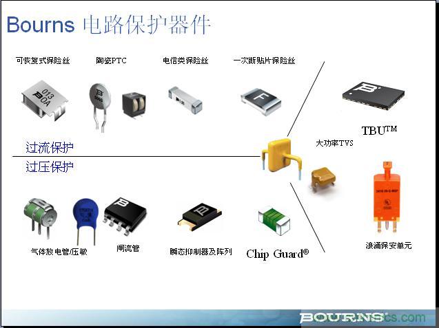 這個是目前我們所有的保護元器件。保護元器件來說,我們主要分為兩塊,一個是過流的,一個是過壓的。過流包括可恢復式保險絲、陶瓷PTC、電信類保險絲、一次斷貼片保險絲。過壓保護的包括氣體放電管/壓敏、閘流管等。另外我們還有大功率TVS、TBU、浪涌保安單元。