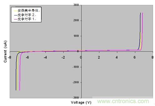 當(dāng)對以上器件的DC性能進行比較的時候,結(jié)果看起來似乎是相同的(參見圖2所示曲線)。此外,它們都聲稱符合IEC61000-4-2第4級標(biāo)準,這就意味 著它們將都經(jīng)受住高達8 kV接觸電壓的ESD沖擊。確保保護敏感IC的ESD保護器件至關(guān)重要的性能不是DC性能; 盡管器件符合IEC61000-4-2的第4級標(biāo)準是重要,但更重要的是保護IC。為確保在ESD事件期間IC沒有被損壞,保護二極管必須把ESD電壓鉗 位至足夠低的值,使IC不會損壞。