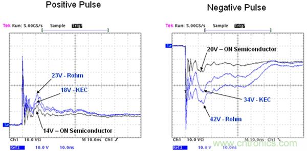 從圖3所示的屏幕圖上可見,顯然,與兩個競爭對手的器件(藍色波形)相比較,安森美半導(dǎo)體保護解決方案(黑色波形)提供更低的ESD脈沖鉗位電壓。與競爭對 手2的18 V和競爭對手1的23 V相比較,安森美半導(dǎo)體的器件將正脈沖鉗位在14 V。而在負脈沖期間,這三個器件之間鉗位電壓的差異更加明顯。安森美半導(dǎo)體、競爭對手2和競爭對手1的器件對負脈沖的鉗位電壓分別是20 V、34 V和42 V。在負ESD脈沖期間這三種器件之間有明顯的區(qū)別,競爭對手2的器件的鉗位電壓比安森美半導(dǎo)體的器件高70%,而競爭對手1的器件的鉗位電壓則是安森美 半導(dǎo)體器件的兩倍之多。通過競爭對手的保護器件后的剩余負脈沖電壓對那些更容易受到ESD破壞的新IC設(shè)計有潛在的危險。然而,安森美半導(dǎo)體的器件卻能在 負脈沖和正脈沖兩個方向上保持低的鉗位電壓,從而將遭受正/負ESD脈沖的破壞風(fēng)險都保持在最低水平。