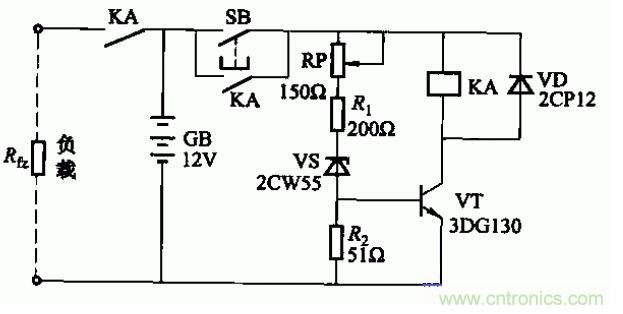 蓄電池深度放電,會使極板硫化,縮短蓄電池的使用壽命。為此可設(shè)置放電保護(hù)器。電路如圖所示。當(dāng)蓄電池電壓下降到終止值(可由電位器RP來改變動作閾值),繼電器KA釋放,切斷負(fù)載回路,使蓄電池停止放電。