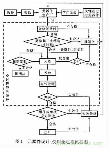 元器件使用全過程包括選擇、采購、監(jiān)制、驗(yàn)收、篩選(拷機(jī))、破壞性物理分析(DPA)、保管、使用、電氣裝配、通電調(diào)試、靜電防護(hù)和失效分析等。元器件的選擇和使用全過程流程圖如圖1所示。