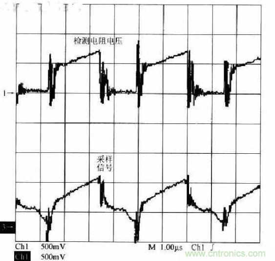 圖4給出了UC3842檢測電阻的電壓波形和采樣信號波形。從圖4中可以看出,經過改進后的電路,其采樣信號的波形緊緊跟隨檢測電阻的電壓波形,沒有出現(xiàn)非常大的尖峰電壓。因此,該電路能有效避免因變壓器漏感等異常干擾引起的電源誤操作的問題,也能有效避免因電源占空比過大而引起的系統(tǒng)不穩(wěn)定的問題。