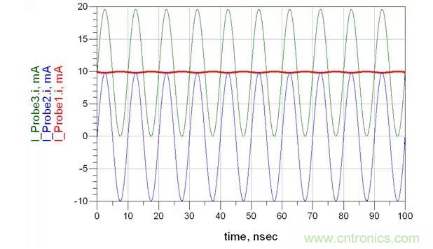 環(huán)路2由一個(gè)100MHz的AC1.0V供電,表示我們的干擾源,電流表2測(cè)量路徑2上的電流。