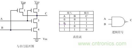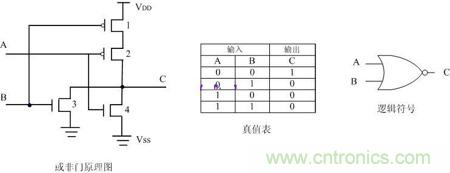 將上述“與非”門、“或非”門邏輯符號的輸出端的小圓圈去掉,就成了“與”門、“或”門的邏輯符號。而實(shí)現(xiàn)“與”、“或”功能的電路圖則必須在輸出端加上一個反向器,即加上一對CMOS管,因此,“與”門實(shí)際上比“與非”門復(fù)雜,延遲時間也長些,這一點(diǎn)在電路設(shè)計中要注意。