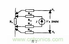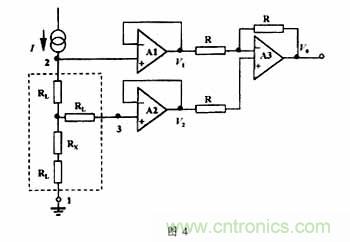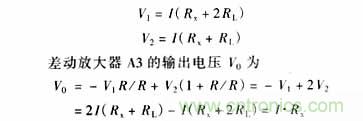 恒流源電流I通過饋線2流入被測電阻,饋線1接地,饋線2和3分別接運放A1和A2的輸入端。若兩運放的增益都為1,其輸出電壓V1和V2為: