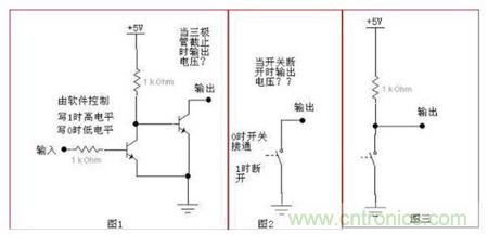 我們將圖1簡化成圖2的樣子。圖2中的開關(guān)受軟件控制,“1”時斷開,“0”時閉合。很明顯可以看出,當(dāng)開關(guān)閉合時,輸出直接接地,所以輸出電平為0。而當(dāng)開關(guān)斷開時,則輸出端懸空了,即高阻態(tài)。這時電平狀態(tài)未知,如果后面一個電阻負(fù)載(即使很輕的負(fù)載)到地,那么輸出端的電平就被這個負(fù)載拉到低電平了,所以這個電路是不能輸出高電平的。