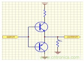 集電極開路輸出的結(jié)構(gòu)如圖1所示,右邊的那個三極管集電極什么都不接,所以叫做集電極開路(左邊的三極管為反相之用,使輸入為"0"時,輸出也為"0")。對于圖1,當(dāng)左端的輸入為“0”時,前面的三極管截止(即集電極C跟發(fā)射極E之間相當(dāng)于斷開),所以5V電源通過1K電阻加到右邊的三極管上,右邊的三極管導(dǎo)通(即相當(dāng)于一個開關(guān)閉合);當(dāng)左端的輸入為“1”時,前面的三極管導(dǎo)通,而后面的三極管截止(相當(dāng)于開關(guān)斷開)。