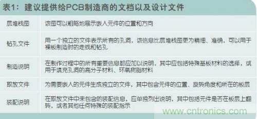 在設(shè)計(jì)嵌入元件時(shí),為了確保成功無誤,重要的一點(diǎn)是與PCB制造商充分的溝通,表1中羅列出了建議提供給PCB制造商的文檔以及設(shè)計(jì)文件。