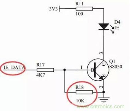 再這么解釋一下吧,如果IE_DATA那個地方,不連接任何引腳,那么由于R18的下拉作用,IE_DATA就是低電平,所以三極管就不會導(dǎo)通。