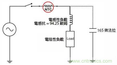 為限制涌浪電流,將NTC熱敏電阻放置于電源以及PFC電容器和電感性負(fù)載電容器之間(圖2)。開機(jī)時,NTC熱敏電阻溫度低,故能提供高電阻。除了限制進(jìn)入電容器中的電流外,此高電阻產(chǎn)生的熱能將提高熱敏電阻的溫度。