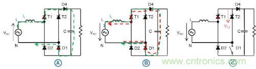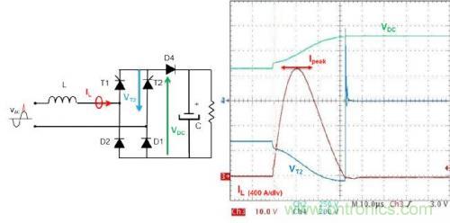 在 90°相角時,T1和D1導通。浪涌提高電流,并致使D4導通,因為PFC電感保持電壓。浪涌電流旁通二極管D4,避免燒毀PFC續(xù)流二極管(D3)。