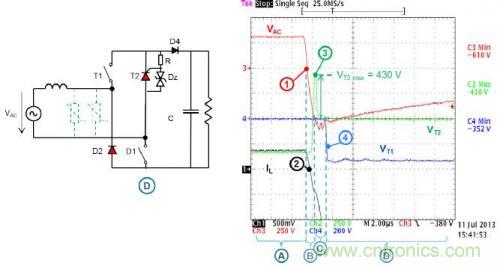 ·C階段:T2在第3點導通,電壓高于Transil擊穿電壓,施加到T2的電壓最大值被限制在430 V。然后D2也導通,施加浪涌,給輸出電容充電。