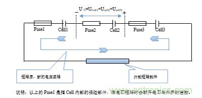 說明:以上的Fuse1是指Cell內(nèi)部的保險(xiǎn)部件,在電芯短路時(shí)會(huì)斷開電芯與外界的連接。 Fuse1Cell1Fuse2Cell2Fuse3Cell3+_U反=UCell1+Ucell2+UcellX外部短路部件短路后,新的電壓回路。