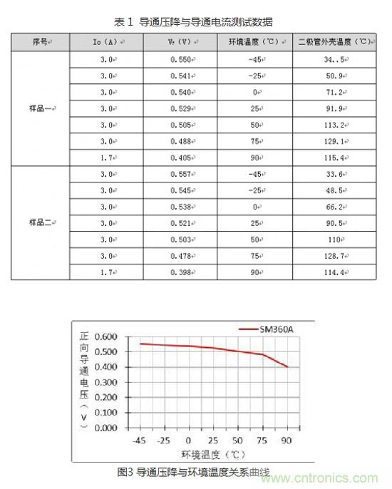 在我們開發(fā)產(chǎn)品的過程中,高低溫環(huán)境對電子元器件的影響才是產(chǎn)品穩(wěn)定工作的最大障礙。環(huán)境溫度對絕大部分電子元器件的影響無疑是巨大的,二極管當(dāng)然也不例外,在高低溫環(huán)境下通過對SM360A的實測數(shù)據(jù)表1與圖3的關(guān)系曲線可知道:二極管的導(dǎo)通壓降與環(huán)境溫度成反比。在環(huán)境溫度為-45℃時雖導(dǎo)通壓降最大,卻不影響二極管的穩(wěn)定性,但在環(huán)境溫度為75℃時,外殼溫度卻已超過了數(shù)據(jù)手冊給出的125℃,則該二極管在75℃時就必須降額使用。這也是為什么開關(guān)電源在某一個高溫點需要降額使用的因素之一。