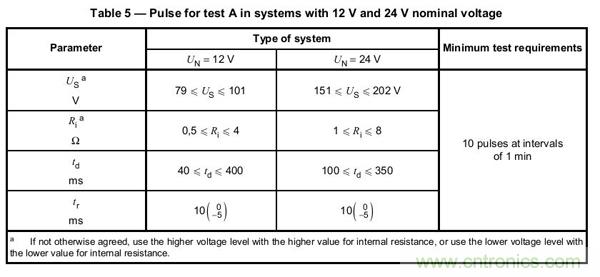 在新的汽車(chē)ISO標(biāo)準(zhǔn)中,拋負(fù)載測(cè)試已經(jīng)采用ISO-16750-2 (2010) 替代了舊標(biāo)準(zhǔn) ISO-7637-2 (2004)。 在這2個(gè)標(biāo)準(zhǔn)中最大的區(qū)別就是新標(biāo)準(zhǔn)要求10分鐘10個(gè)波形,而舊的7637-2只是要求測(cè)試1次拋負(fù)載波形。而測(cè)試的Us電壓要求也更嚴(yán)格了,從原來(lái)的174V限制提高到202V,具體請(qǐng)參考標(biāo)準(zhǔn)中的表格: