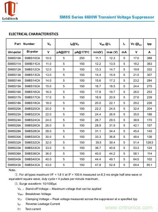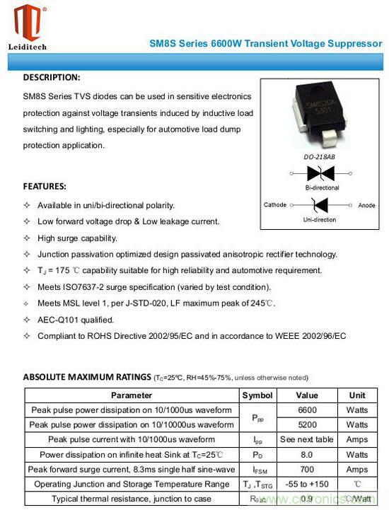 從規(guī)格書(shū)上來(lái)看,SM8S系列產(chǎn)品的功率都在6600W,通過(guò)的峰值電流由于電壓不同而變化,電壓越大,電流越小。先列出規(guī)格書(shū)來(lái)看下: