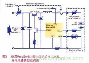 由于PolySwitch器件快速而有效地將過電流限制到安全水平,且體型小巧,可直接貼裝到電路板,因此,可使用該器件對PND內(nèi)的每條電源電路進行一對一的保護。圖3為使用了PolySwitch電路保護器件的便攜式電子設(shè)備中的電池充電電路典型結(jié)構(gòu)圖。PolySwitch和鉗位二極管共同保護設(shè)備不受過電壓、極性反轉(zhuǎn)等故障的損害,保護汽車電源及電路不因便攜式電子設(shè)備內(nèi)部故障而損壞。